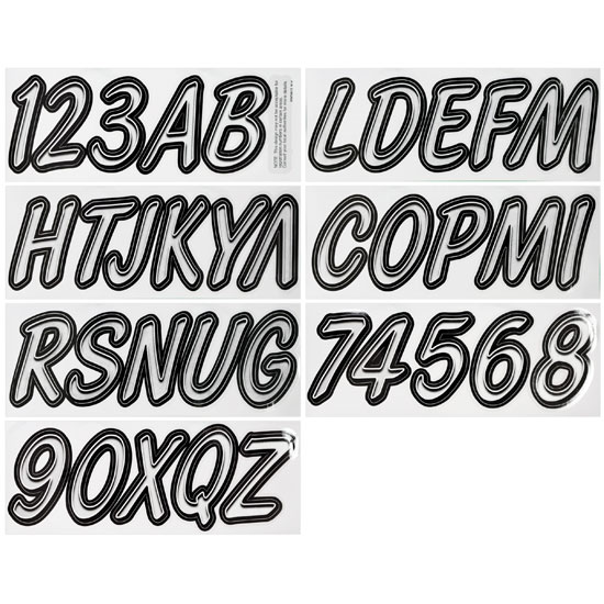 Hardline Products Silver/Black 3" Airbrush Font Boat Lettering Kit (4/Pk). 3" size factory-matched color kit includes 4 each of the letters A-Z and the numbers 0-9, for a total of 146 decals. These boat letter & number decal kits resist fuel, fading and scratches. They are UV gloss coated for protection from the sun and meet USCG & state guidelines when installed correctly. 100% lead free inks. Just peel and apply.